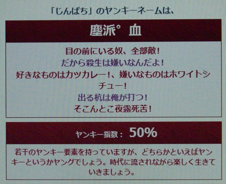 >じんぱちさんの「派゜」がいいですね。なんか性格も可愛いヤンキーさん(´▽`*)
